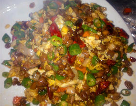 杭椒切末,豆子用开水泡十分钟,鸡蛋三个炒碎盛出