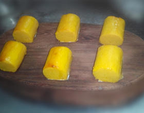 等待冷确一天后,就可以烤了,底火150度,面火250度,烤,15分钟,取出,将芝士片放在红薯上,然后再烤,此时等待上色即刻。