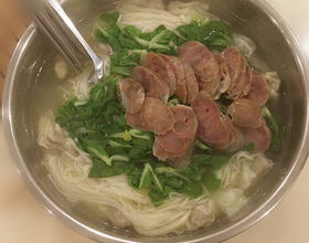倒入青菜烧开,调味料加入拌匀,煮熟的香肠切片放上去。