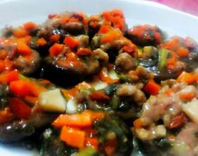 - 2. 然后用料酒洒在准备好的瘦肉上,添加油盐,把准备好的胡萝卜,葱和瘦肉掺在一起,放入适量的生粉,做蘑菇肉酿的馅儿。