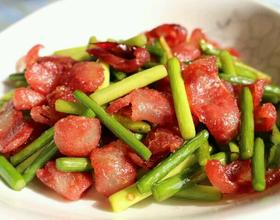 - 4. 接下来倒入蒜苔进行翻炒,刚开始不一起和腊肠炒是因为待炒好时,腊肠会糊,要不然就是腊肠的颜色不好看,吃起来硬。