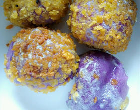 锅中放油,加热后,放入滚好的面包糠油炸,火不要太大,炸至金黄漂浮即可
