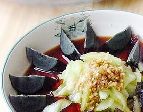滗掉黄瓜里面的水,摆在盘中间,周围围上皮蛋。把调好的汁淋在上面就可以。