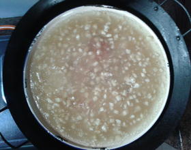 煮好的糖水冲到生浆水中搅拌成生熟浆