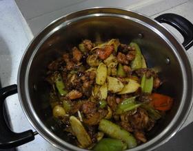 - 6. 全部作料炒出香味后,放研制好的兔肉、不容易熟的配菜、芹菜、大火翻炒。