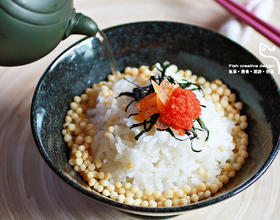 一勺飞鱼籽,滗去茶叶,用茶水淋在饭堆旁边的米果上