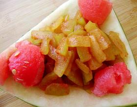 将拌好的西瓜皮,倒入西瓜瓢上即可。