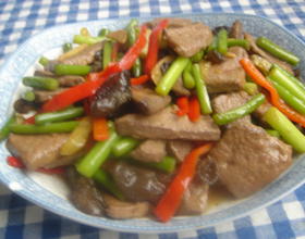 - 2. 鲜猪肝切成厚约2毫米的片(俗称柳叶片)用食盐、料酒、淀粉抓匀上浆备用。