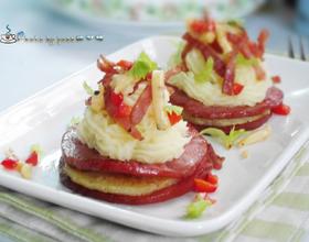 - 11. 肉片 土豆片 肉片叠好,拌好的土豆泥用裱花袋在叠好的肉片上裱出自己喜欢的形状;