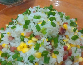 跟着就把米饭放入一起大火翻炒,炒至米饭一粒粒的很松散会跳动就最好啦~