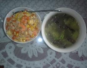 鸡蛋打散,(居然是双黄的)胡萝卜切小丁,虾仁用姜和料酒腌半小时,香葱切碎,玉米粒,米饭(昨天晚上做的)材料备好