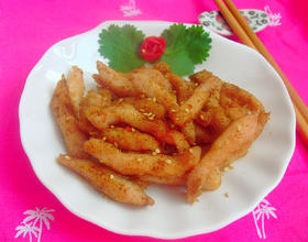 将花椒粉,孜然粉,辣椒粉筛入鸡柳中。