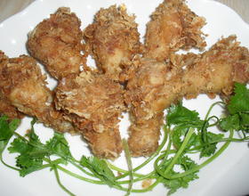 - 9. 锅中加油,以可以炸过翅根为准,烧至六成热,约170-180度,下入翅根,炸制3-4分(翅根周围由很多泡泡逐渐变成少量泡泡,飘起为熟)
