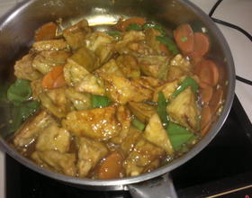 6.锅中放入少许底油,放蒜末,放之前搭配好的调料汁7.放入青椒胡萝卜翻炒2下,放入炸好的茄子块。翻炒到所有茄子块都挂上酱汁关火。