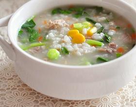 米淘洗干净,加两碗水和一碗高汤煮开。加入肉碎,姜泥。煮到粘稠。