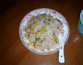 热锅凉油,八成热时下入葱花,加少许盐炒香。下入火腿肠丁炒一分钟,下入青豆玉米粒,炒二三分钟。