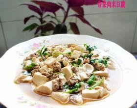 把豆腐切成小块,鲜肉用刀剁成末,香菜切段备用.
