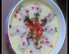 - 14. 把鱼卷铺在已经凝固的蛋羹上面。