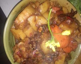 - 6. 上色后加入备好的土豆胡萝卜,拌均