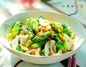藕片、胡萝卜片、西兰花、芦笋分别入加有少许油盐的沸水中焯烫一下;