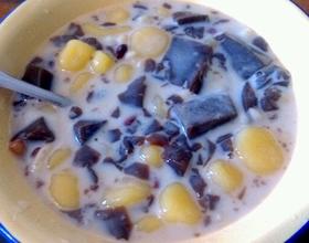 - 1. 原材料:地瓜粉,黑凉粉,切好的地瓜,蜜豆,炼乳