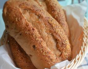 - 8. 面团表面沾水,然后沾小麦胚芽,排在烤盘上,进行最后发酵。
