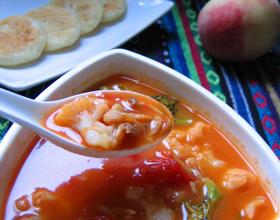 下入菜花、西蓝花、蛤蜊肉和番茄煸炒。