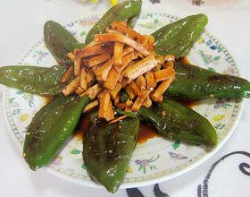 备好的青椒清洗拍扁,香干切丝,切点姜丝。