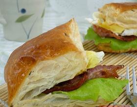 - 9. 一切都弄好后,取出烤好的飞饼,轻轻掰开,加生菜、培根、鸡蛋、抹沙拉酱,就可以美美的享受啦。