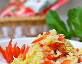 淋过水的包菜丝放在大碗中,放上西红柿碎,倒上酱汁,拌均匀即可。