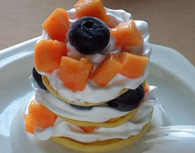 放入木瓜后再放入一个小饼,再挤上奶油,放入蓝莓即可。