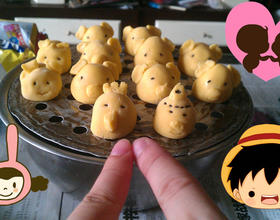 - 6. 将小面团握在手掌心,揉搓成小窝窝头状,底下用手指按一个深洞。然后用另外的面搓成细条做耳朵与猪嘴,用黑芝麻做眼睛和其他装饰物。