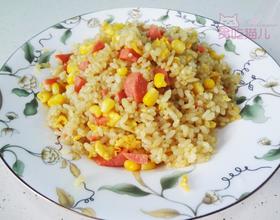 倒入炒好的鸡蛋,玉米粒,火腿丁,翻炒均匀即可出锅。