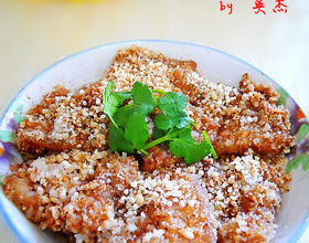- 10. 肉腌了1小时后取出,两面粘上五香蒸肉粉。