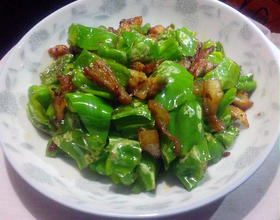 - 4. 把肉赶至锅的一边,将青椒倒进锅里,用锅里的油煸炒至断生时,放盐调味。然后把肉和青椒混合,翻炒均匀,关火,出锅。
