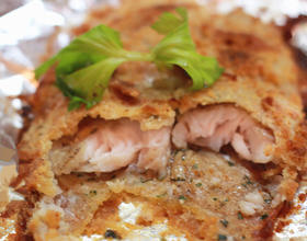 两面裹上制作好的酥皮外壳材料;烤箱预先200度,预热10分钟;烤盘刷油,放入鱼肉,上下档210度烤10分钟,翻面再烤10分钟 即可