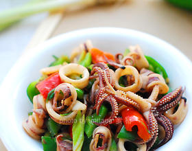 1、海鲜焯水时间不要过长,而且8-9成开的时候放入最好,因为水滚开后焯海鲜容易烫老。2、酱有咸味,不必加盐。3、青红椒要保持爽脆的口感,就要大火快炒,辣椒去筋后可以很大程度上减轻辣的程度!4、此菜注意火候,比管焯后已经熟了,所以和青椒一起要大火快炒,时间要短!