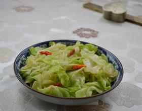 下入包菜,放生抽、糖、盐、味精,翻炒均匀,迅速出锅。