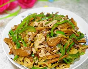 - 2. 猪肉、青椒、榨菜洗净、切丝;花菇提前泡发,洗净、切薄片备用。