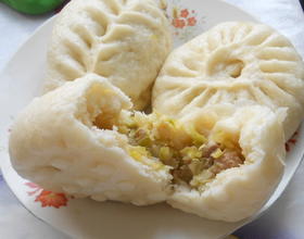步骤四:把提前准备好的菜和肉混合,放入葱姜。调馅的时候要注意把油、酱油、先放入肉中搅匀。另外圆白菜出水,为了不出水,最好面处理好后再放盐。