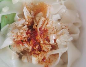 抹油之后的面醒的时间越长,越易拉长,喜欢吃酸的朋友们,可以放上蒜末,不喜欢吃蒜的可以去掉,生抽葱花,辣椒末以及醋是油泼面的必备。