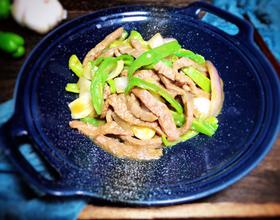 放入青椒和洋葱炒匀,加盐和胡椒粉炒匀至断生