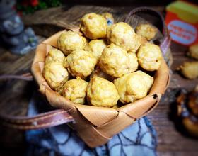 推散后就全浮上油面了,用漏勺轻轻拌动,使丸子受热均匀,继续炸至金黄色,捞出沥油