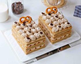 - 17. 依次叠加至蛋糕片用完,最上面挤一层奶油,摆上咖啡豆和饼干即可