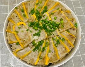 - 4. 锅内烧水,待水开,取一块盘,铺上保鲜膜,将肉沫倒入,表面用少许蛋黄液抹匀,轻震,将空气震出,上锅蒸20分钟左右取出,进行第二次抹蛋黄液,上锅继续蒸20分钟左右