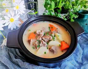 - 11. 炖至山药胡萝卜软烂汤变白色,加入一小勺白胡椒粉和少许盐调味