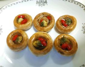 把口蘑翻过来,每个里面放入菊花和枸杞,小火慢慢煎至口蘑里汤汁渗出