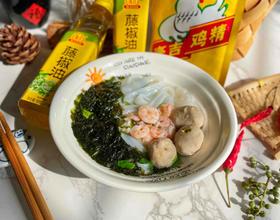 紫菜,藤椒油,肉丸子,河粉,虾仁备好