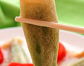 - 4. 竹荪泡好水后取出用手掌轻轻的压掉多余的水分,然后轻轻的把秋葵酿入竹荪里。