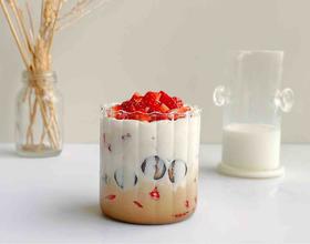 切好的草莓,蓝莓,牛奶,咖啡液备齐